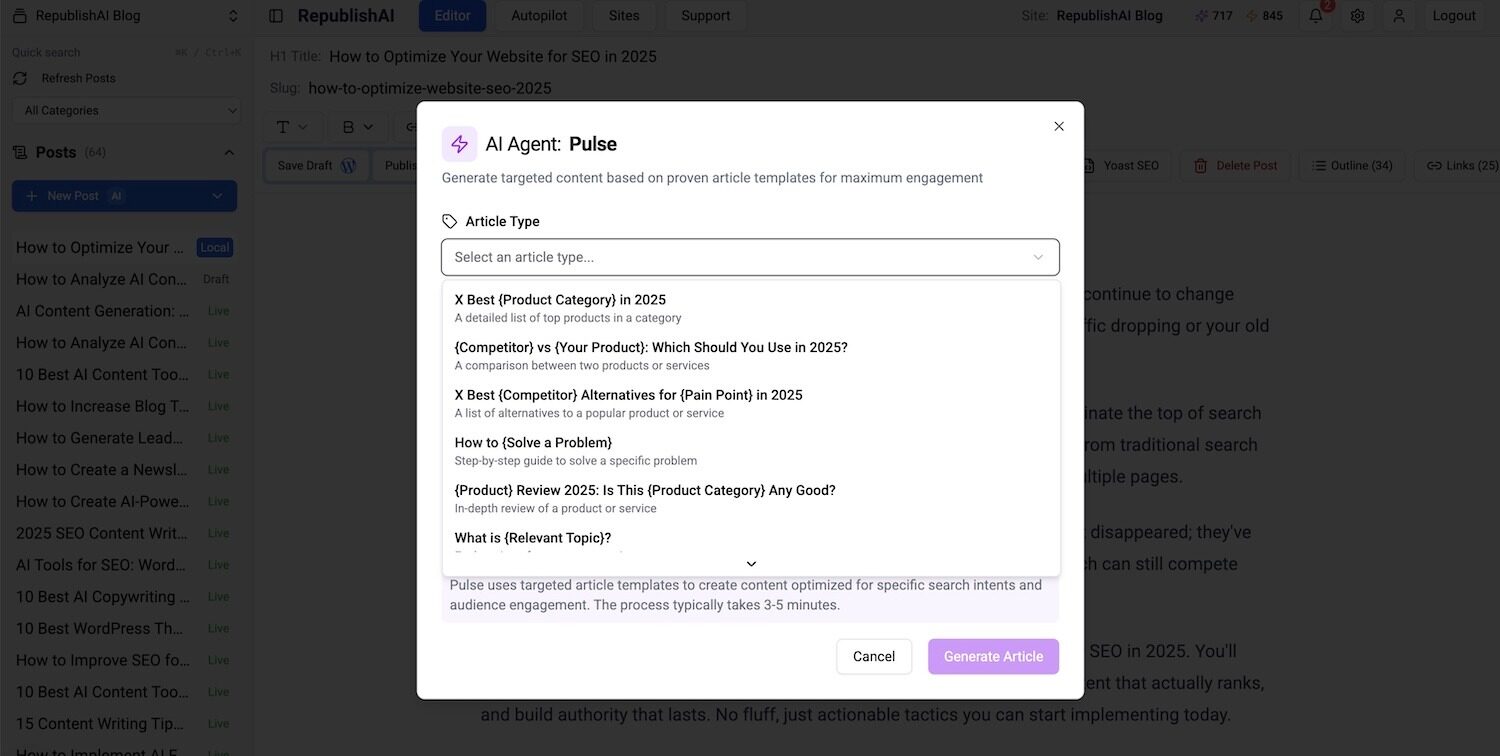 • Pulse AI Agent creates content using proven smart templates like “Best X” lists, “Company vs. competitor” comparisons, and “How-to” guides designed to rank