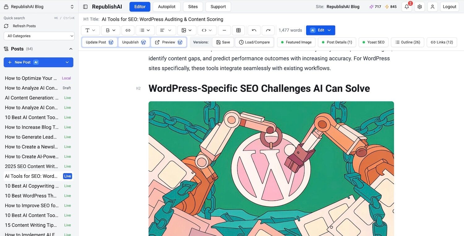 The RepublishAI editor provides fast content management across multiple WordPress sites from one platform. Users can quickly review and edit generated content, jump between posts with one click, and use AI agents for instant rewrites or content improvements. The editor is significantly faster than native WordPress, allowing efficient management of content at scale.
